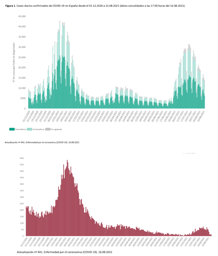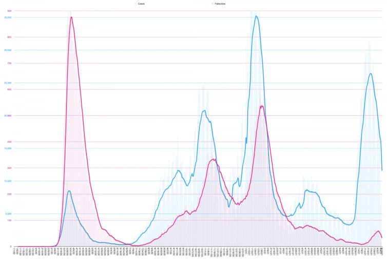 - De abril de 2021 hasta el momento actual. Las cuarta y quinta olas, durante las cuales el número de diagnosticados es mayor que el de fallecimientos. Esta diferencia es especialmente significativa en la que denominamos quinta ola.