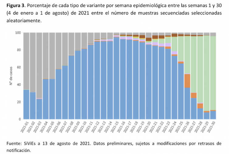Desde el mes de junio de 2021, coincidiendo con la quinta ola, ha ido aumentando progresivamente la variante delta (en verde), respecto a la alfa (azul) que antes era la predominante. Para mediados de agosto, la delta ya suponía más del 85 % de las muestras secuenciadas. Esta variante es mucho más transmisible que las anteriores, lo que puede explicar, entre otras cosas, el repunte en el número de casos.