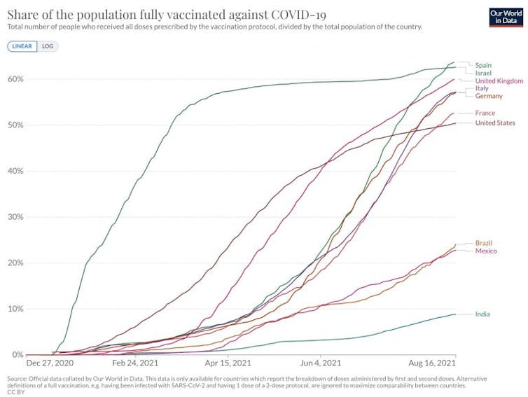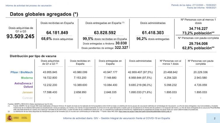 Si nos fijamos ahora en la campaña de vacunación en España, que comenzó a finales de diciembre de 2020, para mediados de agosto España ya tenía al 73,2 % de la población con al menos una dosis y casi al 63 % con la pauta completa (el 68 % de los vacunados con Pfizer, el 9,8 % con Moderna, el 15,8 % con AstraZeneca, y el 6,4 % con Janssen).