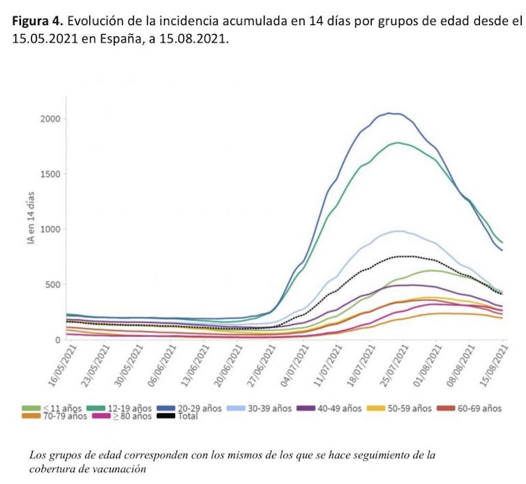 En esta figura vemos la evolución de la incidencia acumulada por grupos de edad.