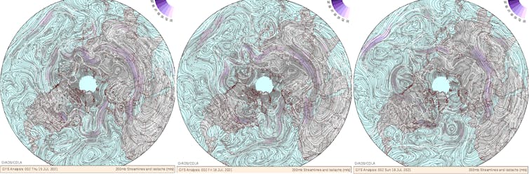 La situación del chorro polar los días anteriores muestra un esquema en Ω invertida sobre el Atlántico central, similar, pero inversa a la que produjo la ola de calor extremo en los estados de Oregón y Washington de los EE UU y la Columbia Británica de Canadá.