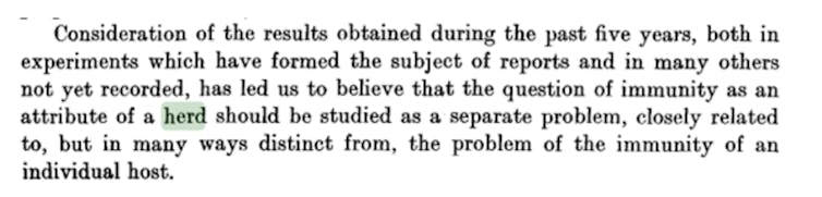 El término “inmunidad de grupo” lo acuñaron hace casi 100 años W. C. Topley y G. S. Wilson. Inicialmente se planteó como posible hipótesis para explicar por qué una infección bacteriana en ratones se diseminaba de forma diferente en función de la proporción de ejemplares inmunizados artificialmente para el experimento. Más despacio cuanto más individuos inmunizados.
