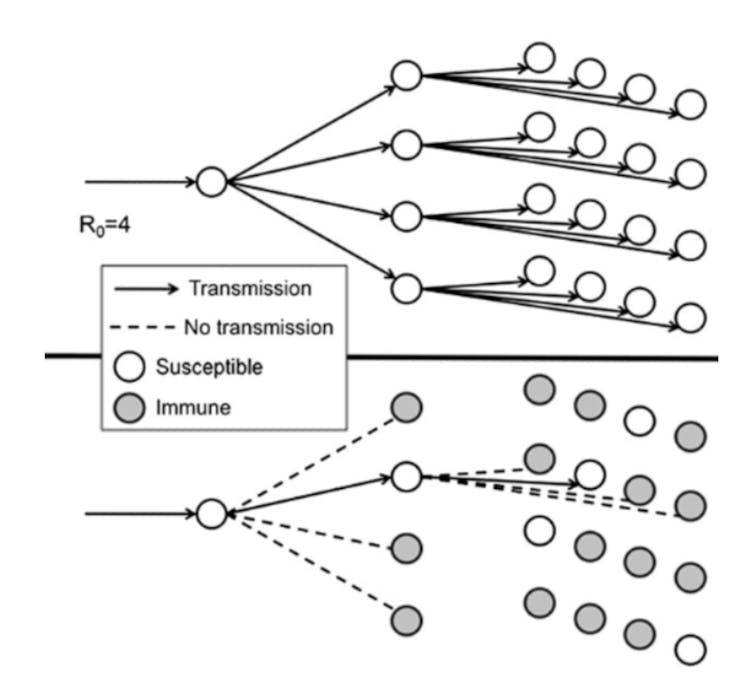 Por ejemplo, si consideramos un patógeno hipotético con un R0 de 4, en promedio, un huésped infectado infectará a otros cuatro durante el período infeccioso, asumiendo que no existe inmunidad en la población. Cuanto más transmisible es un patógeno, mayor es su R0 asociado y mayor es la proporción de la población que debe ser inmune para bloquear la transmisión sostenida.