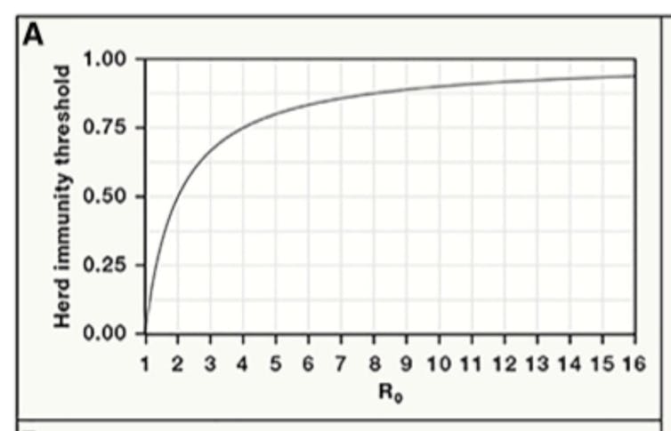 Este umbral de la inmunidad grupal depende de R0 o número de reproducción básico, que se refiere al promedio de infecciones secundarias causadas por un solo individuo infeccioso introducido en una población completamente susceptible.