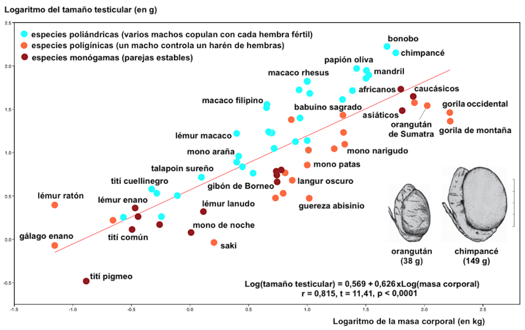 Una de las principales diferencias físicas entre estos modelos reproductivos se encuentra en el tamaño de los testículos de los machos. En la siguiente gráfica se recopilan datos de la bibliografía (Schultz 1932; Harcourt y colaboradores 1981, 1995; Moller 1988; Dixson 2009) para 65 especies de primates y las tres poblaciones principales de nuestra especie. Se aprecia que, a igualdad de tamaño corporal, las especies promiscuas se sitúan sobre la recta de ajuste, pues sus testículos son considerablemente más grandes que en las que forman parejas estables o harenes.